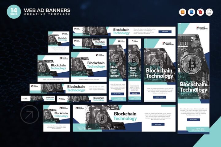 We can help! Our google Blockchain Technology adsense web banner series might be the right option for you 🙂 We provide you with 14 different sizes in four format each (AI, PSD, EPS, PDF, JPG).The banner is 100% vector and you can resize the file into any sizes without loosing its quality. Editing the content is also easy using Adobe Illustrator and Adobe Photoshop software. We hope you like it!
