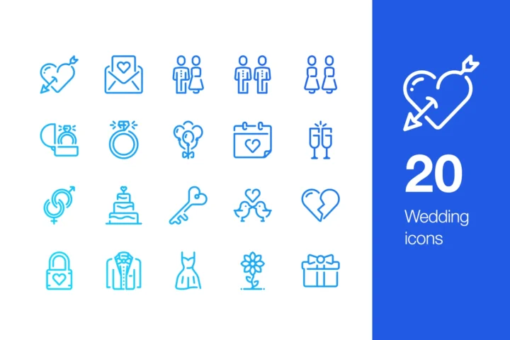 20 icons in outline style of Wedding. Each icon is pixel perfect and based on 44×44 px grid.