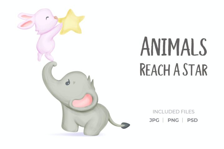 Animals, Cute, Baby, Nursery, Watercolor, Isolated, Clipart, Children, Character, Cartoon, Rabbit, Star, Dreams, Elephant, Friend,