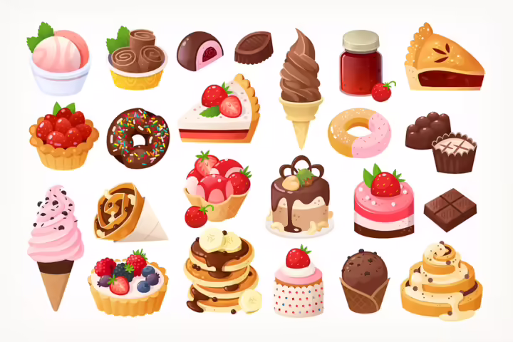 Ice creams, cakes, pies and muffins. Jam, sweets, donuts and more ice creams.