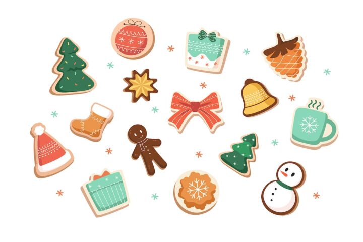 Colourful Collection Of Christmas Cookies Vector Illustration. This Icons will great for your landing pages, social media, maps, banners, icons, infographics, books, websites, applications, etc. Vector isolated characters.