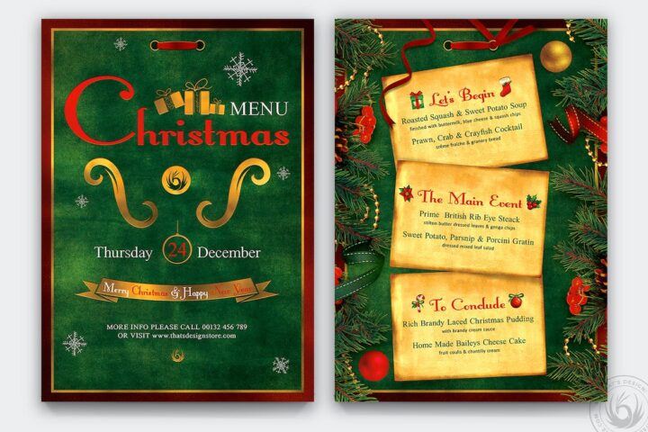 Christmas, Xmas, Menu, Card, Restaurant, Eve, Celebration, Flyer, Design, Diner, Template, Magic, Green, Red, Gold,
