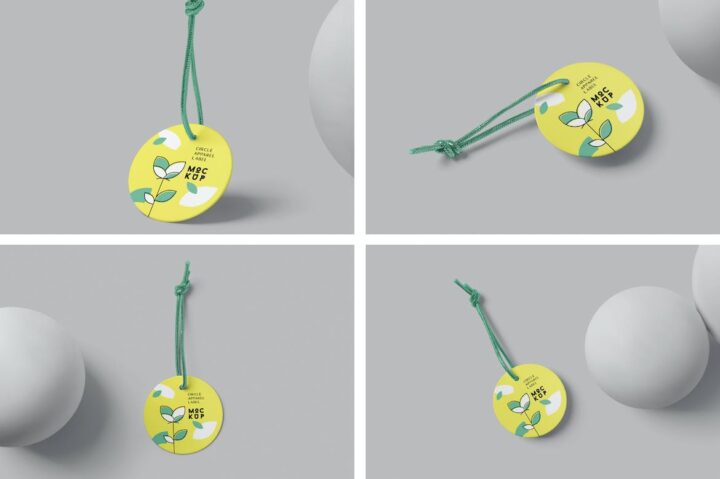 These circular hang tag mockups will show your apparel label tag designs realistically. You can customize everything in these mockups including designs, colors, effects, shadows and the background as well.