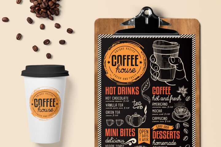 Coffee, Menu, Template, Design, Chalkboard, Drink, Placemat, Restaurant, Cafe, Flyer, Drawing, Illustration, Brochure, Beverage, Vintage,