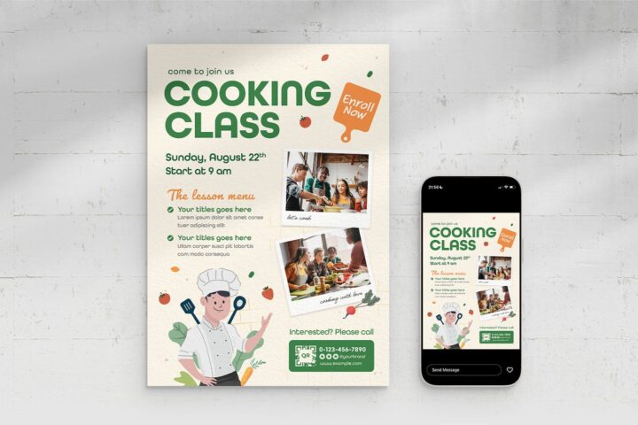 Embellished with illustrations of a chef, chopping board, cooking utensils, and assorted vegetables, this Flyer Template is ideal for culinary schools and kitchens to promote cooking lessons and food activities. Thanks to the cute and rustic vegetable illustrations, this template would also be suitable for vegan and vegetarian restaurants or organic vegetable farmers markets and food fairs. This template comes in Illustrator Ai and EPS Vector formats. Please note that stock photos are used for demonstration purposes only and are not included in the final design.