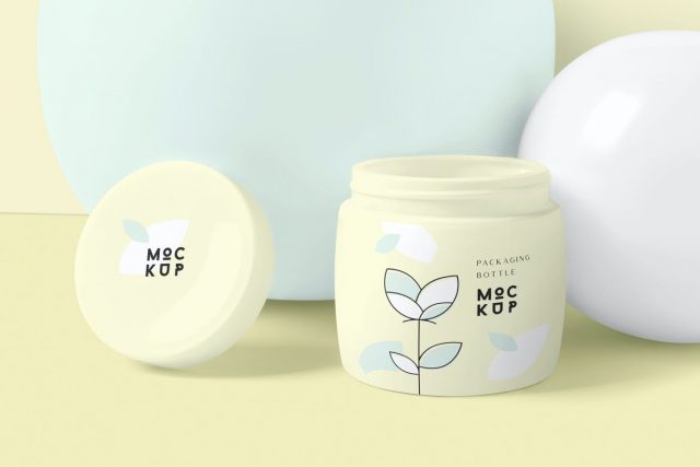 Cosmetic packaging bottle jar mockup with editable shadows and effects.