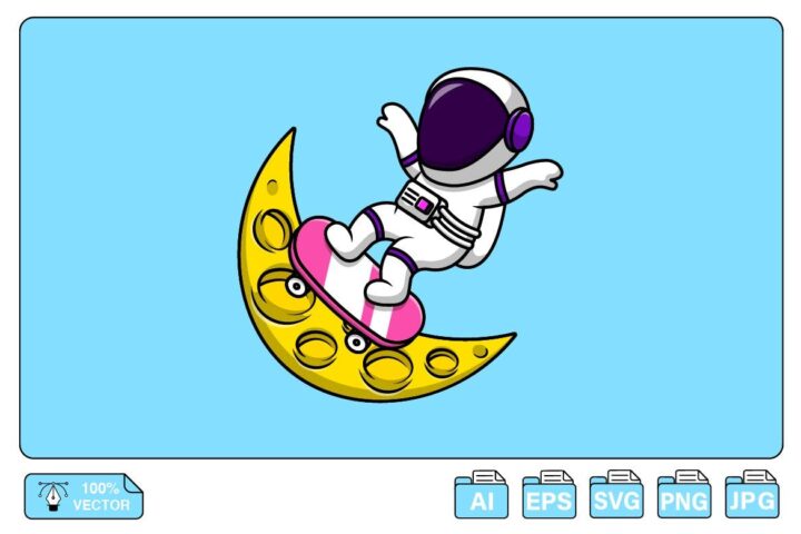 Cute Astronaut Playing Skateboard On Moon Cartoon