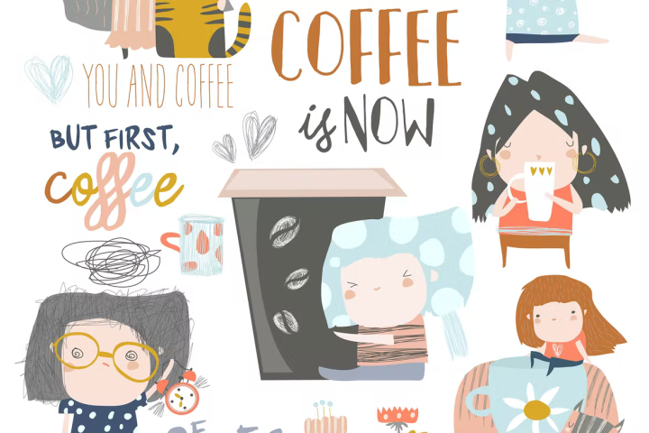 Coffee, Girl ,Vector, Youth, Cup, Drink, Cat ,Sleepy ,Awake, Alarm, Clock, Morning, Breakfast, Friends, Cartoon, gfx