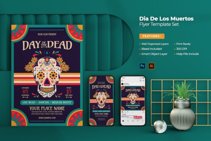 Promote Dia De Los Muertos Flyer Template Set is perfect for promoting Day of The Dead / Dia De Muertos parties and events. All elements are in separate layers and text is editable.