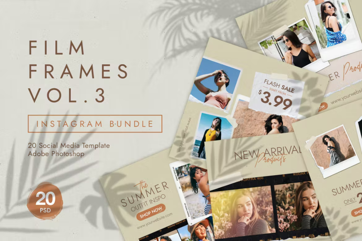 Film Frame Instagram Stories Social Media Bundle Vol.3 Film Frame Clean, sweet, warm inspired by Polaroid Frame Paper with simply and minimalist layout for fashion or lifestyle brand to increase your Instagram reach. Great set for anyone who is looking to step up their game in Instagram for getting more followers and likes! and of course you can use the images in a blog or any other social media too. This set is very easy customizeable all you have to do is replace images with your artwork/photos via Smart Objects and add your text. This template perfect for bloggers, fashion and retail brands, magazines many more!