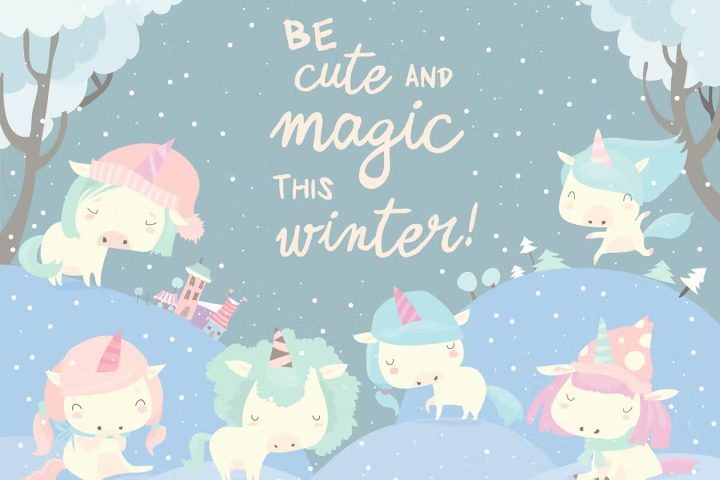 Funny unicorns in snow forest. Vector illustration