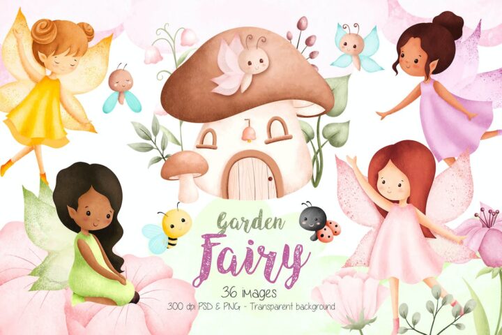 Garden, Fairy, Illustration, Cute, Cartoon, Animal, Watercolor, Girl, Kid, Children, Butterfly, Leaf, Flower,