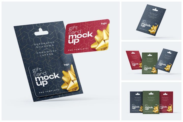 New Gift Card Mockup Set with 4 premium PSD scenes, 4k backgrounds, and trendy designs. This mockup set includes 4 gift card mockups that can use for stores, digital products, sale promotions, VIP services, banks, redeem codes, and other creative designs.
