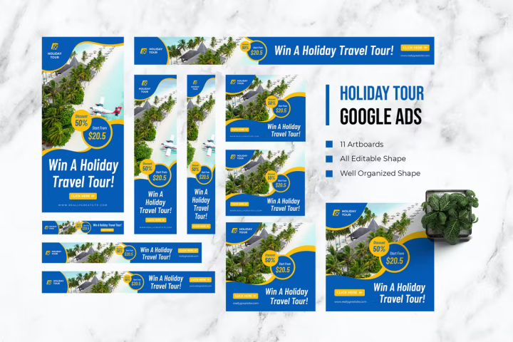 This Google Ads template has fully editable and customizable PSD and AI files. This Google Ads template also has creative style, and it’s suitable for your any purpose such as: travel, holiday, tour and can be also used for any other publishing like marketing promotions and company profile.
