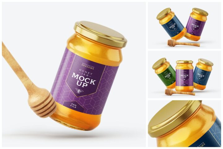 New Honey Jar Mockup Set with 3 scenes, 4k backgrounds, and trendy packaging designs. This mockup bundle includes a total of 3 packaging mockups that can use for honey packaging, label, and branding designs.