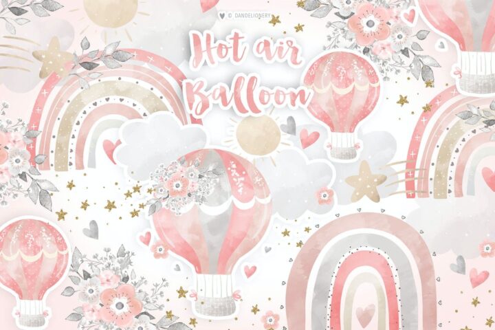 Hot, Air ,Balloon, Rainbow, Girl ,Rainbows ,Clipart, Baby, Natural, Color, Pastel, Sun, Rain, Nursery, Pink, gfx