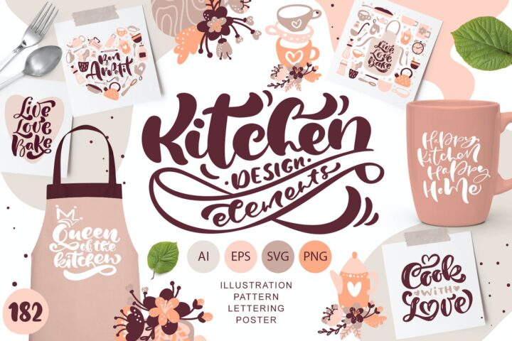 This bundle includes 182 unique Kitchen illustrations and calligraphy lettering phrases: My Kitchen my Rules, Queen of the kitchen, Cook with love, Kiss the cook, Home chef, Enjoy your meal, Happy Kitchen happy home, Wake and Bake, Bon Appetit, Bake Someone Happy, Cooking is love made visible, Cooking is love made edible, The secret ingredient is always Love, Let`s Cook, Live Love Bake, Count the memories not the Calories. All illustrations are hand-drawn by me. This design kit drawn in vector and based on high quality.