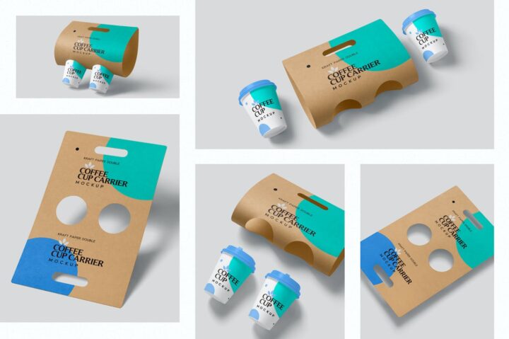 These kraft double cup holder mockups offer two disposable cups with a kraft paper carrier card. Featuring smart object option and well-named layers for the customization of design, color, effects and background. These mockups are best for cafe, restaurant and takeaway cup branding designs.