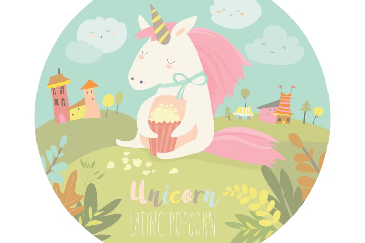 Little cute unicorn eating popcorn. Vector illustration