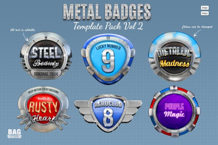 Set of 6 realistic shiny metallic badges. Perfect for club flyers, posters, logos and websites.
