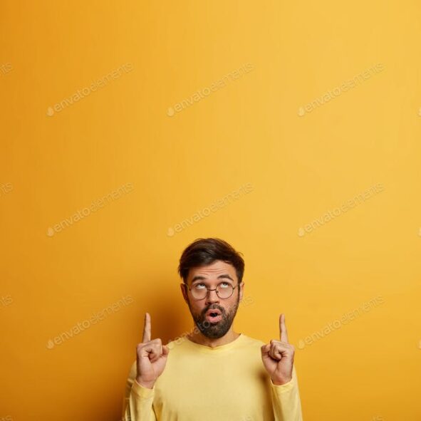 Photo of astonished unshaven man makes annoncement, points index fingers above, demonstrates blank space, good sale offer.