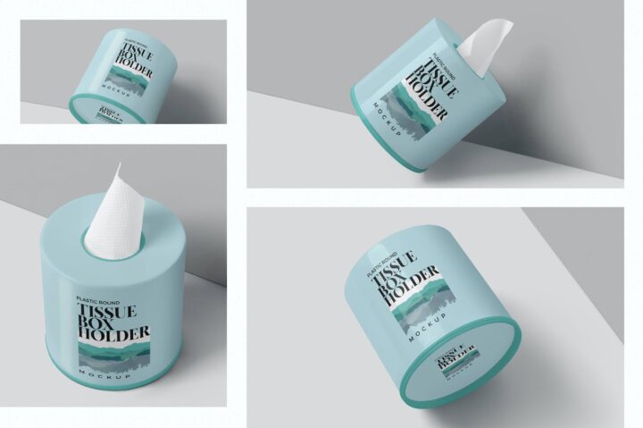 These plastic round tissue box mockups offer plastic box with a tissue paper coming out of the box. Offering smart object option to change the front, bottom and top side design. These mockups also have well-named layers to help you customize the light effects, shadows and background.