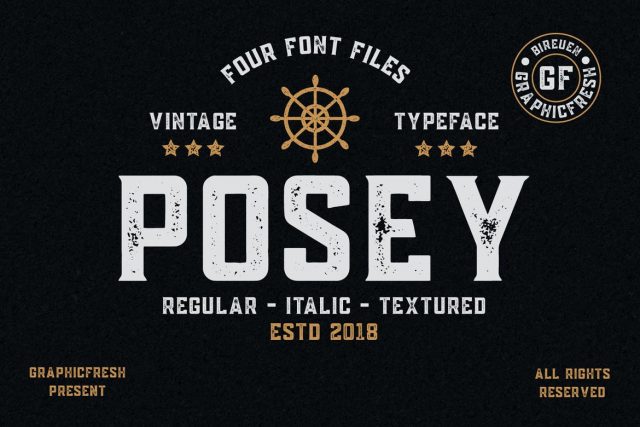 Posey is a vintage display family including Regular and Textured versions as well as Italic versions of each. it’s perfect for logos, name card, magazine layouts, invitations, headers, or even large-scale artwork. Posey includes 4 OTF & TTF files within the Zip folder.