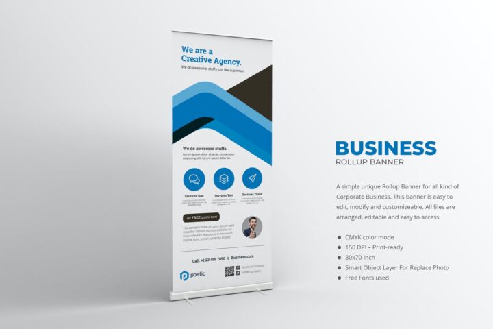 A simple unique Rollup Banner for companies to promote, market or advertise their upcoming events. This banner is easy to edit, modify and customizeable. All files are arranged, editable and easy to access.