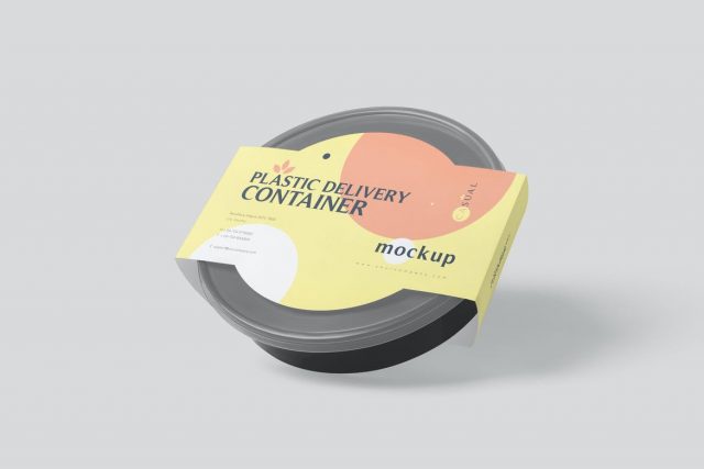 Slanted view of the plastic delivery box mockup to showcase your food packaging designs.