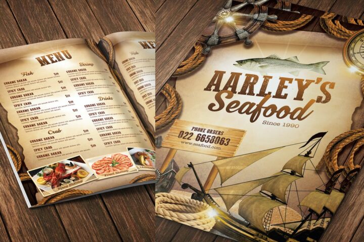 Flyer, Beach, Bifold, Cafe, Crab, Fish, Food, Template, Restaurant, Sea, Seafood, Shrimp, Menu, Pirate, Vintage,