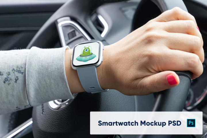 Smartwatch, Smart, Watch, Wearable, Clock, Time, Mockup, Woman ,Hand, Using, Car, Psd, gfx