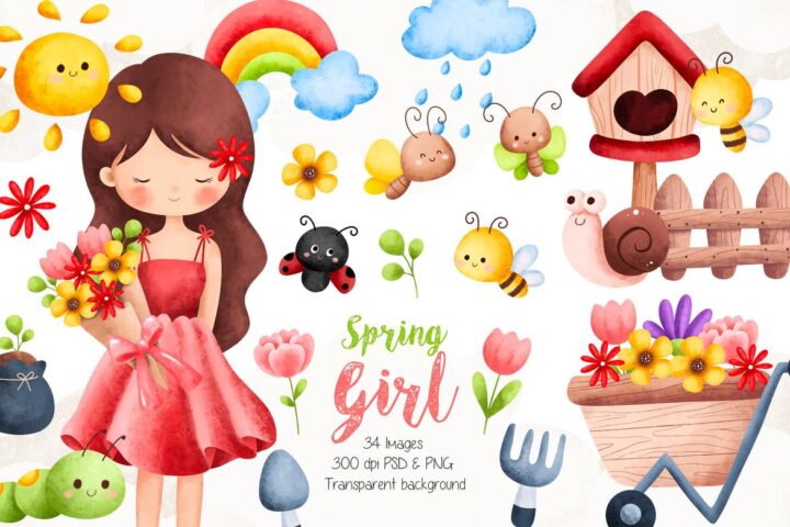 Girl ,Spring, Garden, Animal, Watercolor, Bee, Butterfly, Flower, Illustration, Cute ,Rainbow ,Sun ,Cloud ,Snail, Plant, gfx