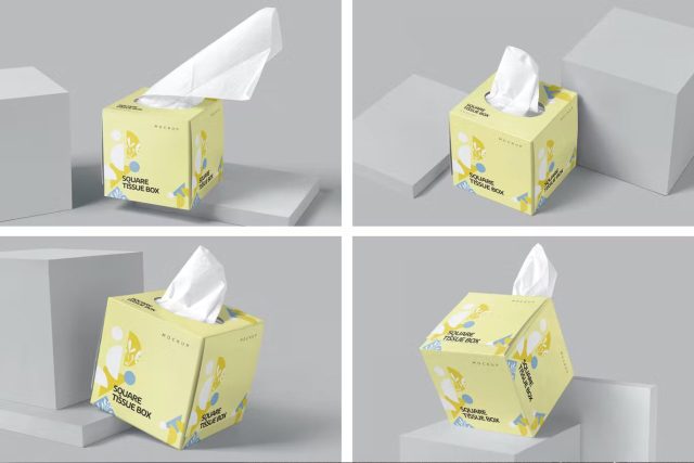 These square tissue box mockups allow you to showcase any of your tissue paper boxes and corporate branding designs in a gorgeous way. Featuring smart object option and intelligent layers for the customization of design, shadows, effects and background.
