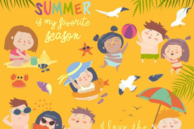 Summer childs outdoor activities. Beach holiday. Happy childhood. Vector set on a yellow background. Happy boys and girls on the sea.