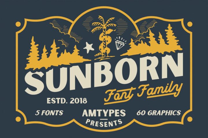 Sunborn is a simple and clean font. inspired from old merchandise such as labels, tins, badges and other vintage packaging. combined with handmade graphics packages, this font is perfect for your project needs such as poster design, label design, branding, logo design, greeting cards, merchandise, T-shirts and more.