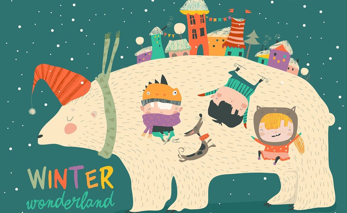 Cute kids celebrating Christmas with big polar bea