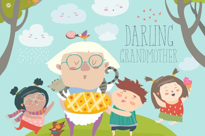 Granny and her grandchildren with cake. Vector