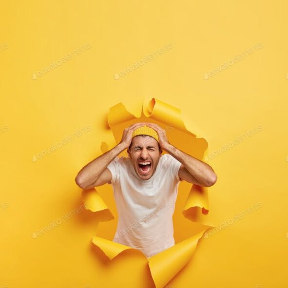 Vertical shot of emotional guy touches head with both hands wears casual white t shirt stylish yel