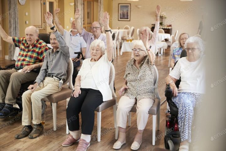 Group Of Seniors Enjoying Fitness Class In Retirement Home