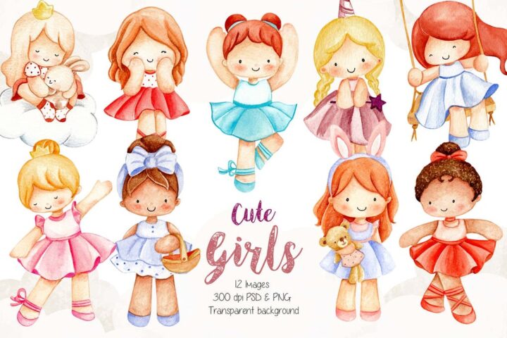 Watercolor Illustration Little Girls