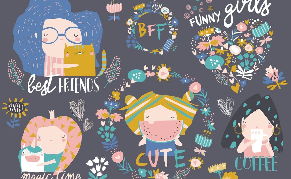 Vector set of cute girls with flowers and wreath