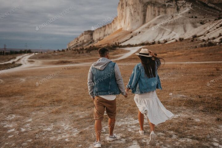 couple in love walks in denim and country clothes – against the backdrop of a mountain landscape