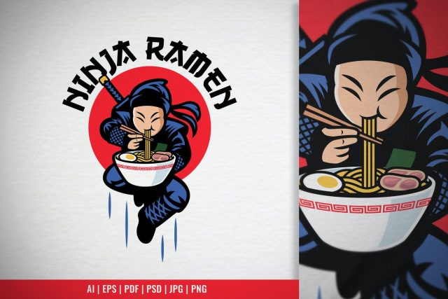 Cartoon Mascot of Ninja Eating Ramen Logo