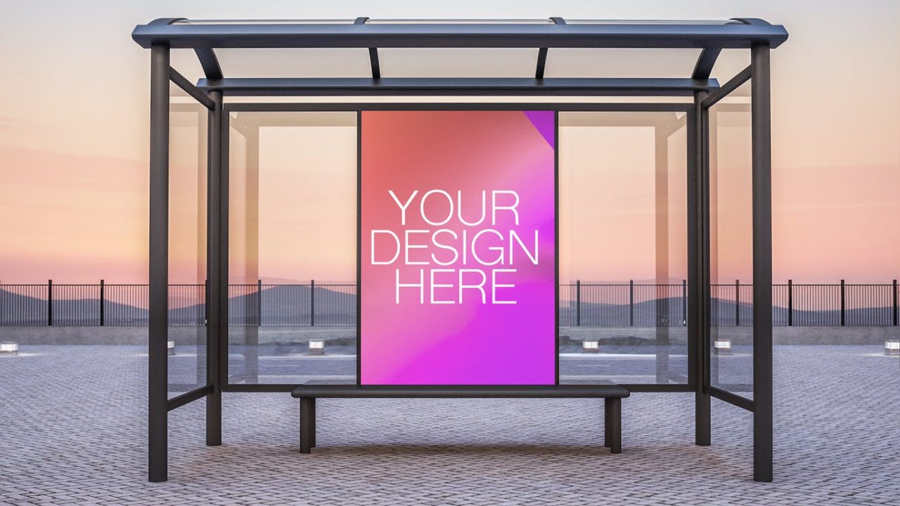 Bus shelter frame mockup on a sunset background