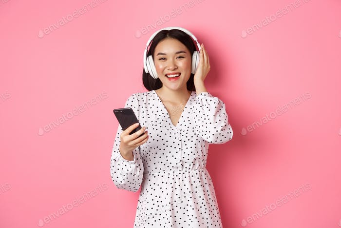 Beautiful asian woman listening music in headphones