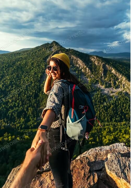 Portrait of a woman holding her man’s hand while walking along a mountain range vertical photo