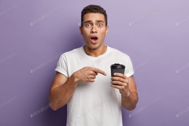 Shot of stupefied young guy points finger at takeaway coffee surprised to have empty paper cup with