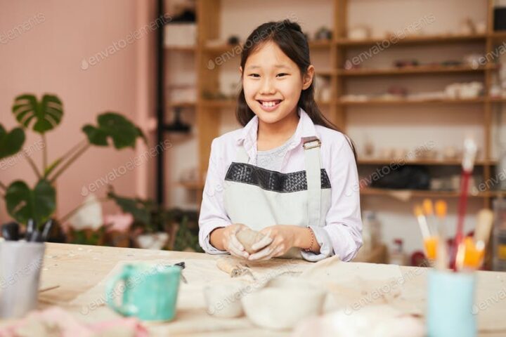 Smiling Asian Girl Enjoying Pottery Class