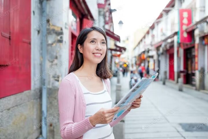 Woman using city map in Macao city