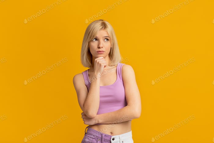 Portrait Of Excited Young Korean Woman Looking At Copy Space With Interest